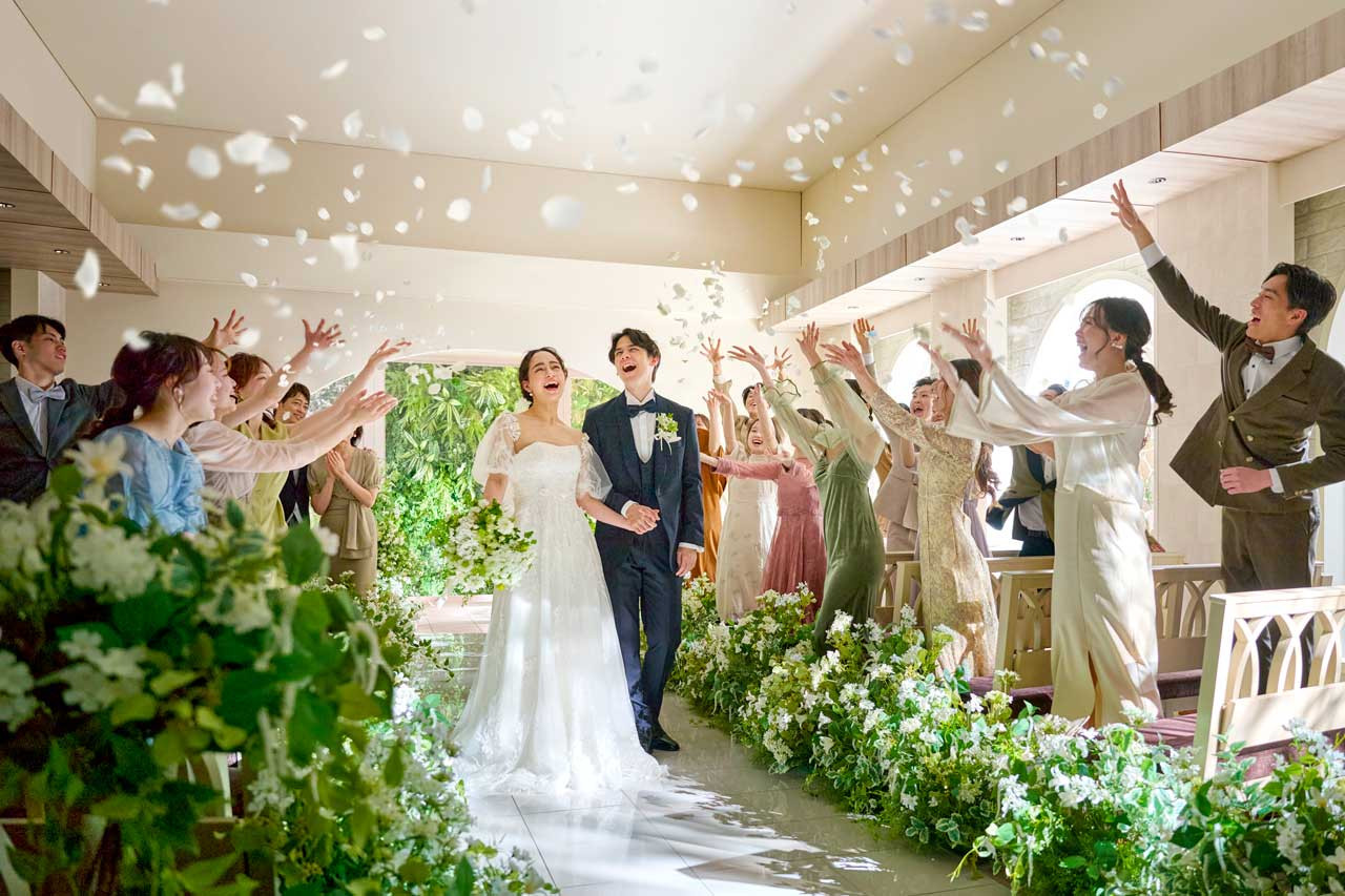 祭壇奥の滝からは心地よく水音が響き、優しく差し込む陽光はまるでふたりの門出を祝福するかのよう。
